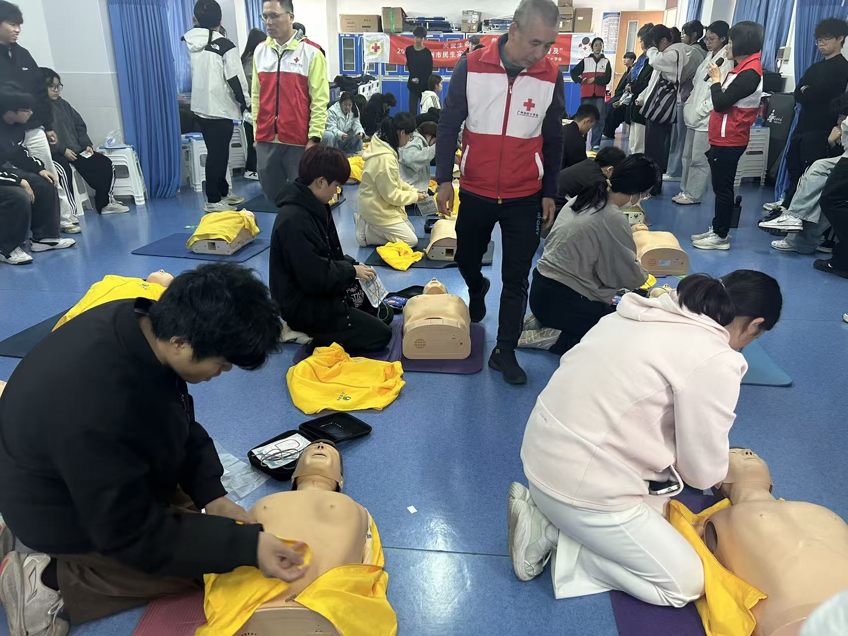 实操练习环节成为本次培训的亮点,参训师生热情高涨、全员投入。在红十字讲师的手把手指导下,大家分组使用模拟人、急救包等专业器材,逐一实操练习心肺复苏按压、人工呼吸、各类创伤包扎等核心技能。讲师们穿梭在各小组之间,针对按压深度、频率、包扎松紧度等关键细节逐一纠错,耐心解答师生疑问,确保每位参训人员都能规范掌握操作要领,真正实现“学得会、用得上、敢出手”。全体师生以严谨认真的态度反复打磨动作,沉浸式提升应急处置能力,现场学习氛围浓厚且高效。