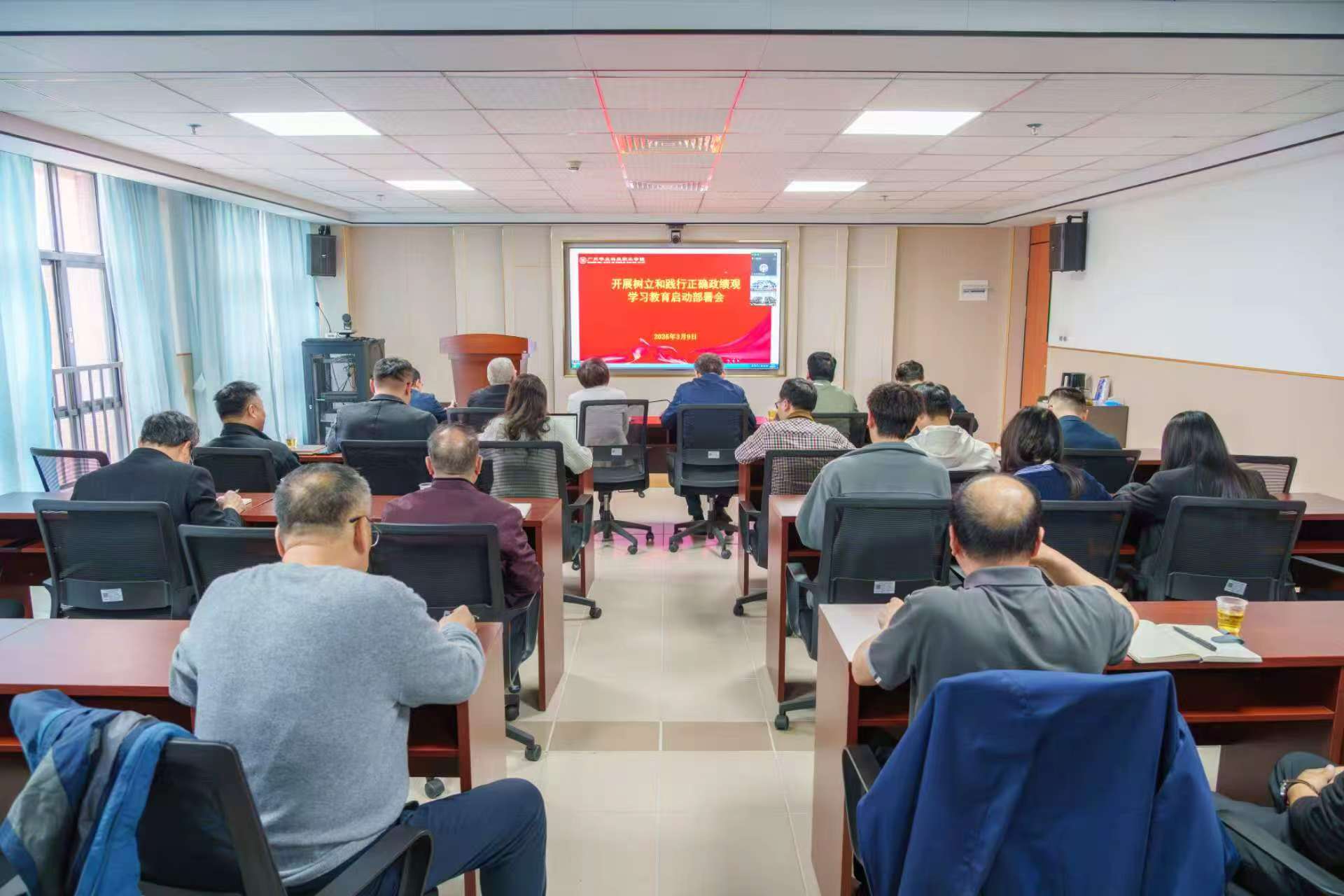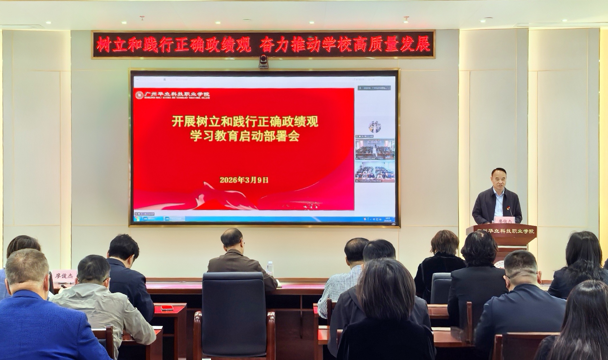 2026年3月9日下午,学校开展树立和践行正确政绩观学习教育动员部署会议在图书馆104会议室召开。学校全体校领导、各职能部门负责人、各二级学院党组织书记和院长参加会议。云浮校区相关领导以视频会议形式参加。会议由广州华立科技职业学院校长、校党委副书记廖俊杰主持,学校党委书记陈良声作了题为《自觉树立和践行正确政绩观 奋力推动学校高质量发展》的动员讲话。