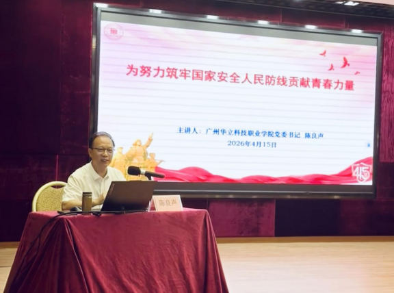 在第十一个全民国家安全教育日到来之际,4月15日,广州华立科技职业学院党委书记陈良声以《为努力筑牢国家安全人民防线贡献青春力量》为题,在东区图书馆一号报告厅为青年学子讲授国家安全教育专题课。专题课深入学习贯彻习近平总书记关于总体国家安全观的重要论述,引导同学们进一步强化国家安全意识,凝聚维护国家安全的青春共识与行动力量。学校党委副书记、副校长高尧来主持。学校党委办公室主任梁德君、保卫处处长陈胜军,党委组织部副部长陈晓薇等相关部门负责人,学校国防教育协会、“蓝焰荔志”消防宣传队全体成员参加学习。