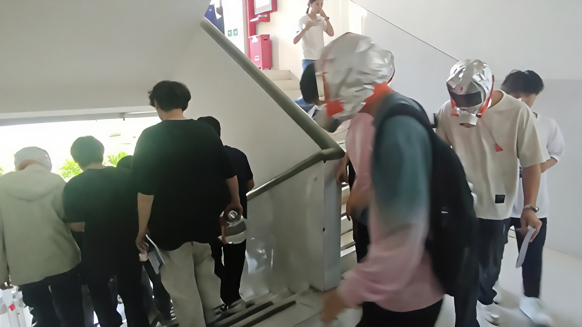 随着演练开始,参训师生在指引下迅速沿楼梯疏散。现场人群低头弯腰、掩住口鼻,有序撤离至安全区域。演练过程中,部分学生佩戴防护头盔,模拟真实火场环境,进一步巩固了“冷静、快速、规范”的逃生原则。