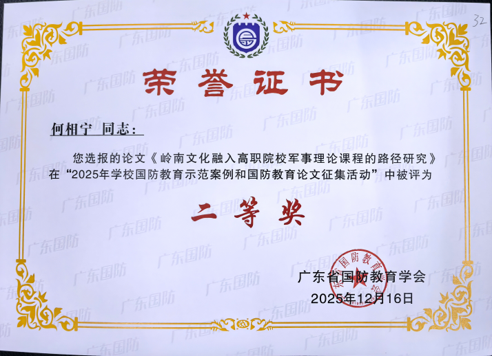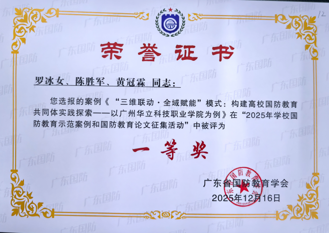近日,从广东省国防教育学会传来喜讯,我校武装部罗冰女、陈胜军、黄冠霖三位老师选报的国防教育案例《“三维联动·全域赋能”模式:构建高校国防教育共同体实践探索——以广州华立科技职业学院为例》,在“2025年学校国防教育示范案例和国防教育论文征集活动”中脱颖而出,荣获一等奖;何相宁老师的论文《岭南文化融入高职院校军事理论课程的路径研究》荣获二等奖。这一成绩充分展现了我校在国防教育领域的创新实践与显著成效。