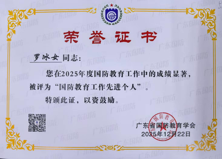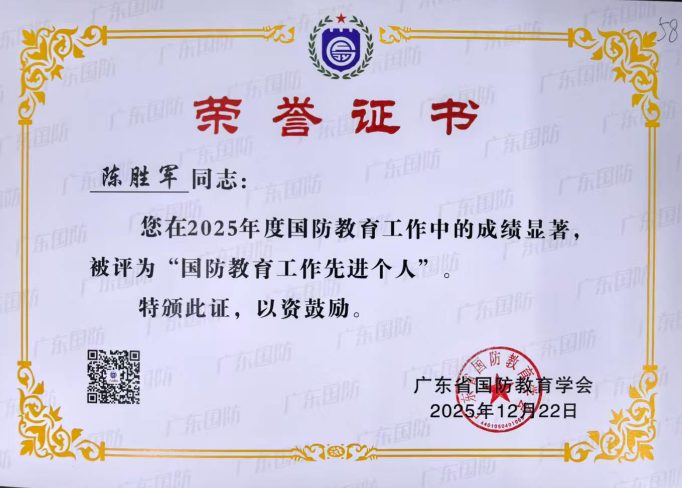 近日,广东省国防教育学会正式公布了2025年度国防教育工作评优结果。广州华立科技职业学院凭借过去一年在国防教育领域的扎实工作和突出成效,荣获“2025年度国防教育工作先进单位”称号。同时,我校武装部陈胜军同志与罗冰女同志因表现优异,双双被评为“2025年度国防教育工作先进个人”。