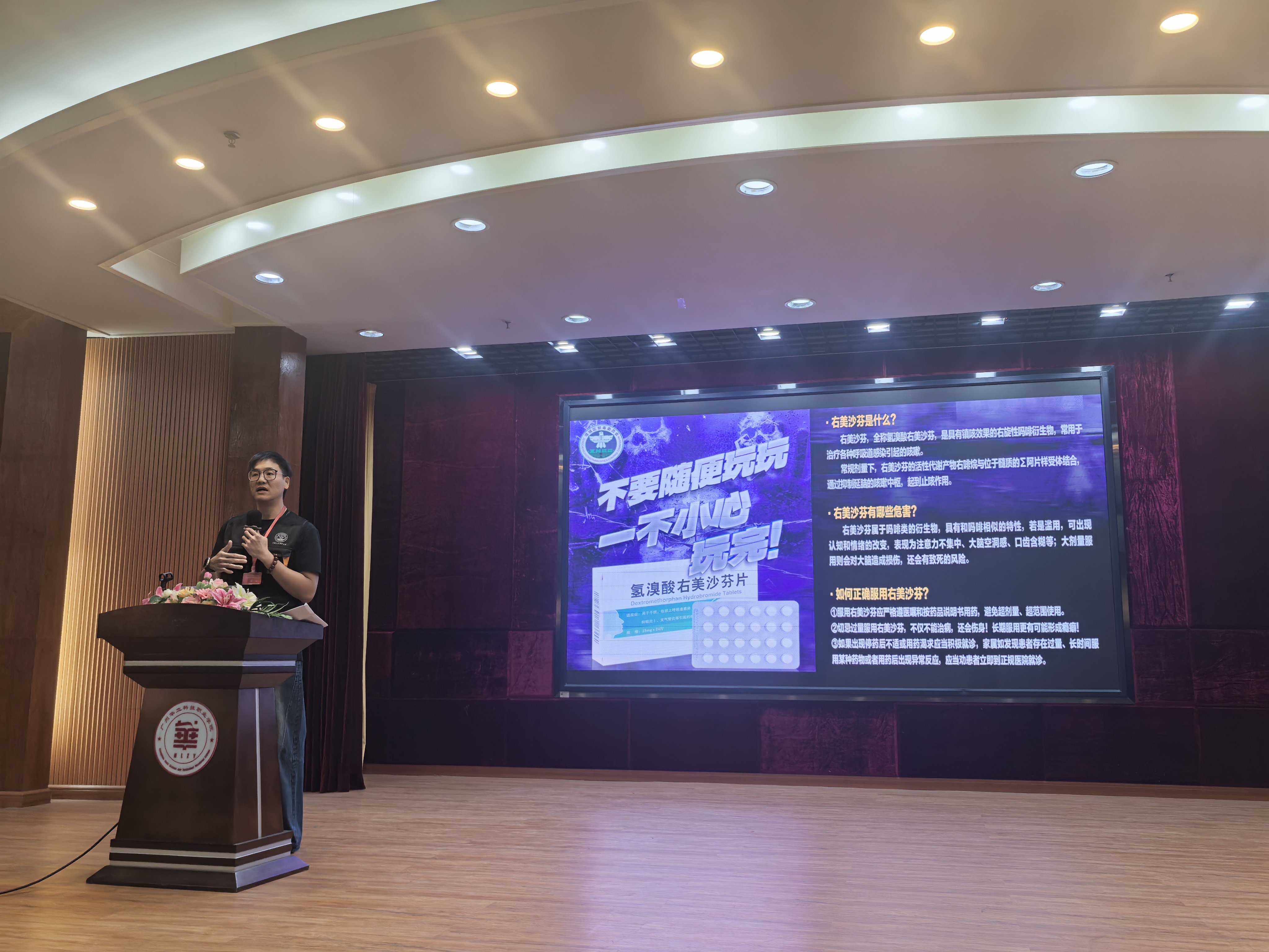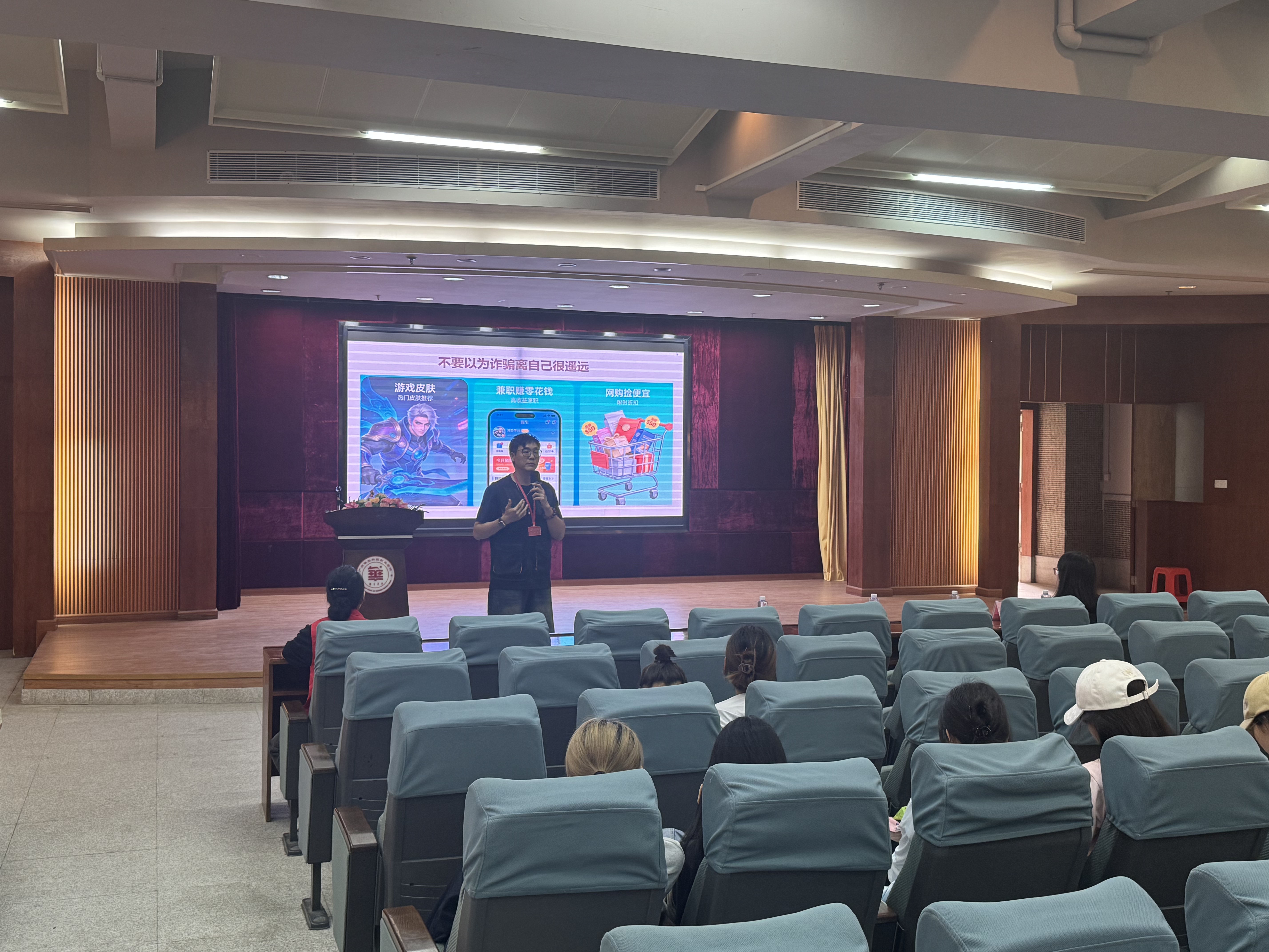 讲座以“反诈防骗、禁毒防毒”为主题,采用知识讲解、视频播放、现场问答互动相结合的形式,内容贴近学生生活、实用性强。在反诈宣传环节,主讲人陈世瑜结合高校高发诈骗案例,重点讲解刷单返利、“约炮”交友等典型诈骗类型,深入剖析诈骗分子的作案手法、话术套路与识别要点,提醒同学们提高警惕,不轻信、不透露、不转账,守住个人财产安全。