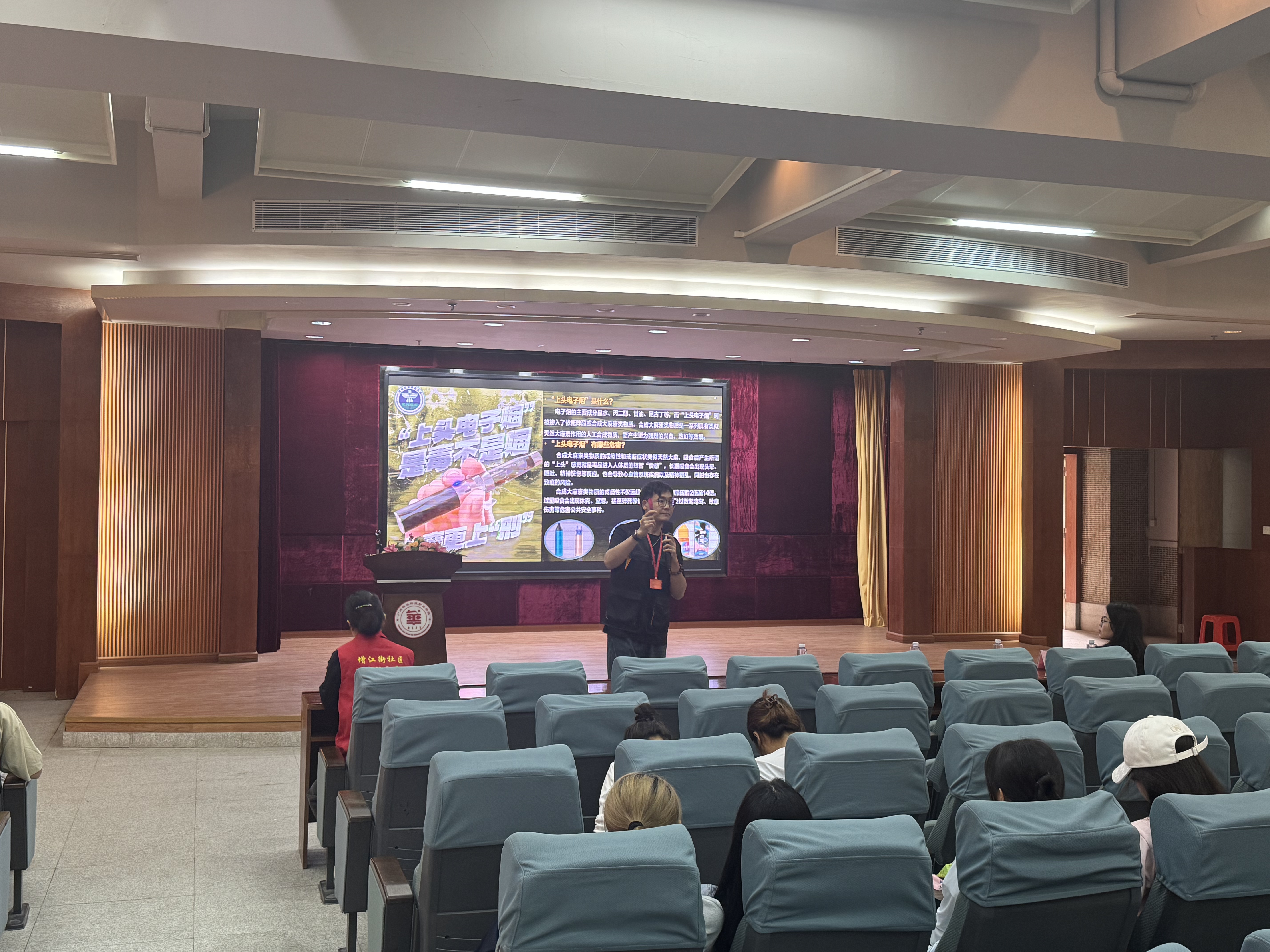 在禁毒宣传环节,主讲人围绕毒品危害、新型毒品伪装形式及电子烟安全风险展开讲解,通过真实案例与警示视频,让同学们直观认识毒品对个人、家庭及社会的严重危害,引导大家树立健康生活理念,自觉远离毒品与违规电子烟,筑牢思想与行为“防毒墙”。