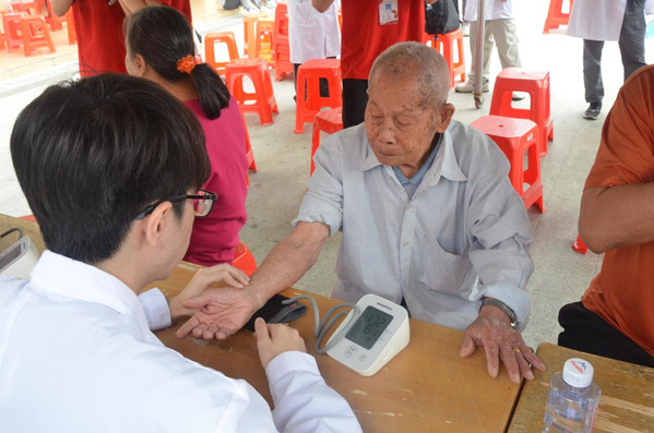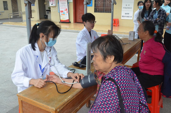 积极参加义诊活动的同学们,耐心地为每一位到场的村民测量血压和脉搏,详细记录他们的测量数据,并根据每个人的具体情况提出了相关的保健建议。