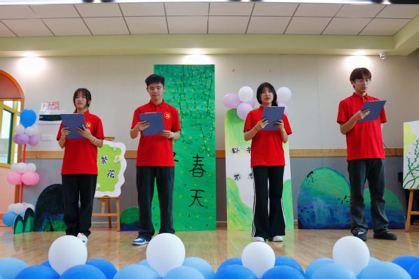 活动伊始,教育学院四位同学为到来的家长和在场的小朋友们表演了诗歌朗诵《春的诗行》。他们饱满且富有情感的朗诵,仿佛为现场家长和小朋友们呈现出了春天生机勃勃的景象。志愿者同学表演结束后赢得了家长们阵阵掌声。