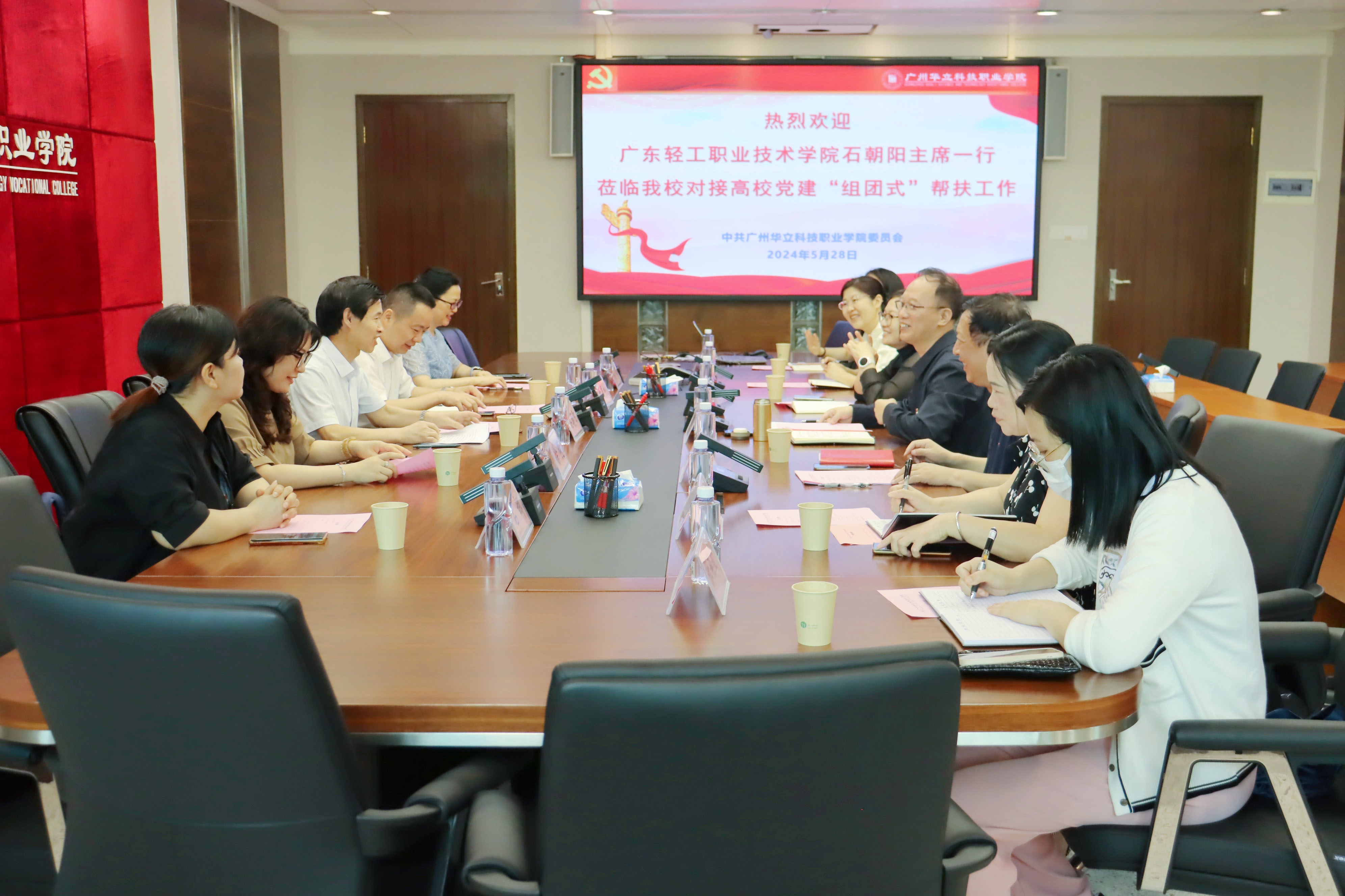 5月28日上午,广东轻工职业技术学院党委委员、工会主席、机关党委书记石朝阳率党委办公室、马克思主义学院、艺术设计学院、财贸学院等有关负责人,前来我校开展党建组团帮扶调研交流。我校党委书记陈良声出席调研交流会议,校长陈德清在会前接见了广轻工石朝阳主席一行,常务副校长马俊全程陪同。调研交流会由我校党办主任刘宇赤主持,党委办公室、人事处、马克思主义学院、艺术与传媒学院、经济管理学院等部门和二级学院有关同志参加调研交流。