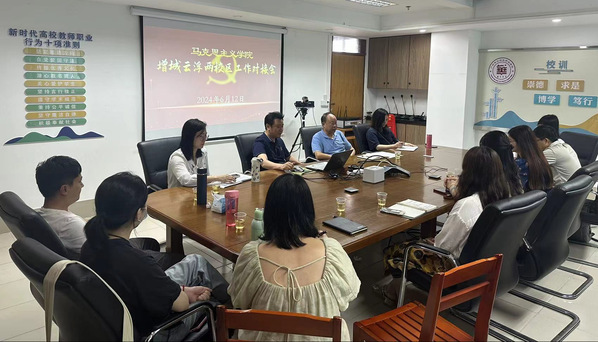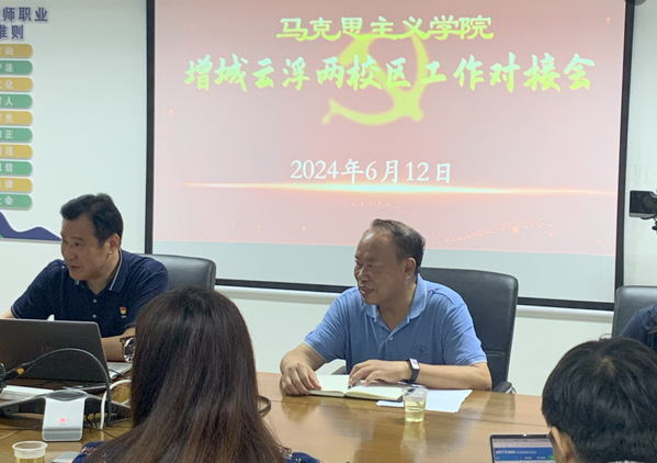 6月12日上午,马克思主义学院在3教807会议室召开增城·云浮两校区工作对接会,学习习近平总书记近期对思政课建设重要指示精神,推动党纪学习教育落到实处,总结本学期工作成绩,布置本学期后段工作。廖良初院长、张燕金主任、增城校区教师代表以及云浮校区全体思政课教师参会。会议由谭剑林副院长主持。
