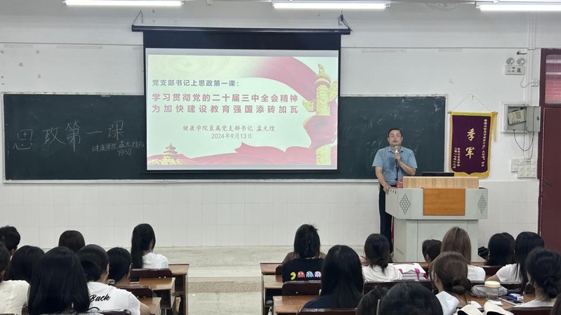 根据学校党委工作安排,2024年9月13日下午,健康学院直属党支部在图-402教室为学院24级健康管理、口腔医学技术等6个专业的新生代表,组织一堂别开生面的思政第一课。党支部书记孟允煌以《认真学习领会党的二十届三中全会精神为加快建设教育强国添砖加瓦》为主题,鼓励同学们刻苦学习、勇于实践、艰苦奋斗、与时俱进、开拓创新,为加快建设教育强国和实现中华民族伟大复兴的中国梦贡献自己的青春和力量。