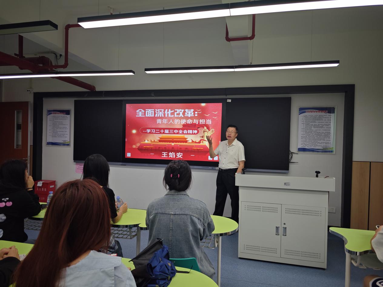 9月23日上午,艺术与传媒学院副院长王焰安以《全面深化改革:青年人的使命与担当——学习党的二十届三中全会精神》为题在西三211教室开讲新学期“思政第一课”。