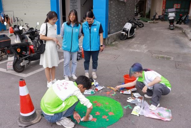 活动期间,志愿者们携带专业绘画工具和环保颜料,在社区工作人员的引导下,以社区沙井盖作为创作平台,围绕“绿美广东”“多色社区”“IP形象”等主题,结合桃源里社区特色,精心设计了多款图案,旨在通过艺术的形式,向社区居民传递多彩生活、美丽社区的理念,提高大家对社区的归属感与认同感,也为社区带来了一抹亮丽的色彩。