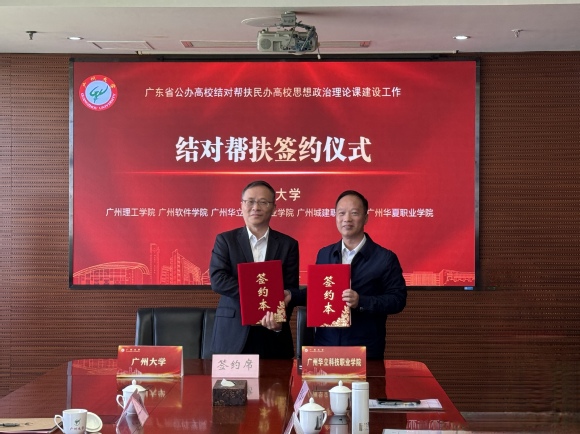 最后,广州大学党委常委、副校长吴开俊与我校陈良声书记签约了广州大学与广州华立科技职业学院思想政治理论课建设结对帮扶协议。