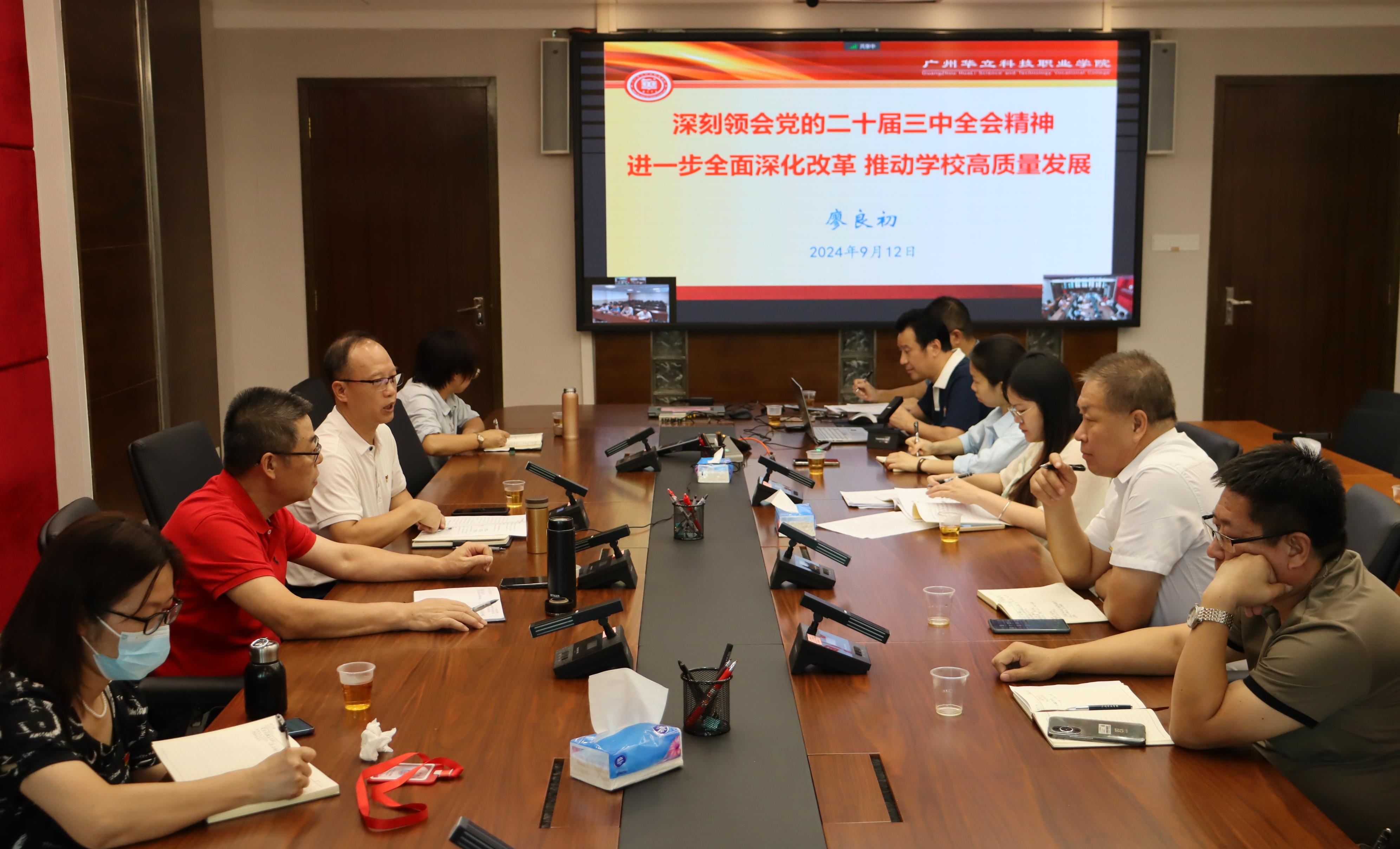9月12日下午,我校在行政楼305会议室召开党委理论学习中心组(扩大)学习会议,马克思主义学院院长廖良初教授作题为《深刻领会党的二十届三中全会精神,进一步全面深化改革,推动学校高质量发展》的专题报告。党委书记陈良声主持会议,学校领导、党委委员、纪委委员以及党委各部门、各二级党组织的负责人参加学习会,云浮校区的相关领导通过视频连线参加。