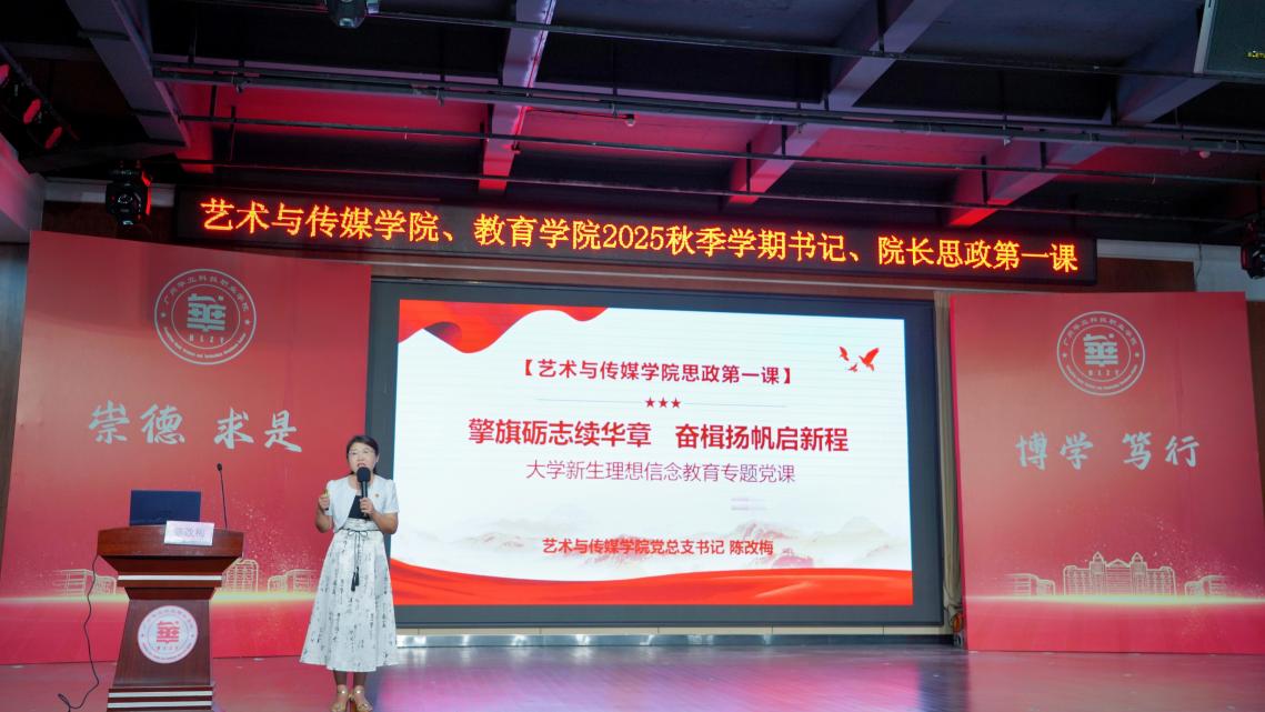 为引导和帮助青年学子学会用习近平新时代中国特色社会主义思想的先进理论武装头脑,将个人成长与民族复兴紧密相连,扣好人生“第一粒扣子”,9月11日晚,艺术与传媒学院党总支书记陈改梅老师以 “擎旗砺志续华章 奋楫扬帆启新程”为主题,在图书馆八楼报告厅,为艺术与传媒学院、教育学院新生带来了情感触动强烈、思想启迪深刻的“思政第一课”。学院院长朱君、教师党员和2025级新生参加听课。
