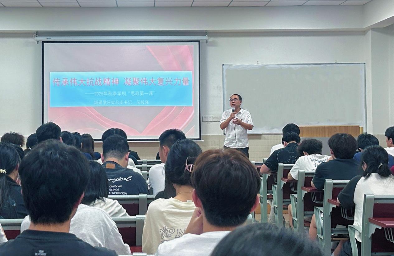 2025年10月14日,城建学院党总支书记吴毅强在第二教学楼408教室,为24级、25级各专业学生代表讲授主题为“传承伟大抗战精神 凝聚伟大复兴力量”的“思政第一课”,引导青年学子从抗战历史中汲取精神力量,锚定民族复兴使命。