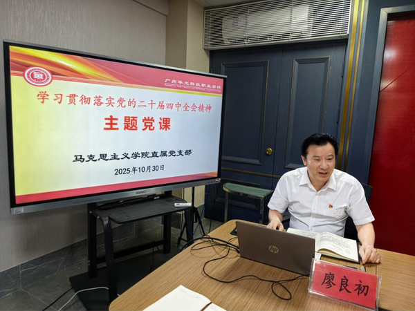 2025年10月30日,马克思主义学院直属党支部在G1-314会议室开展学习贯彻党的二十届四中全会精神主题党课活动。主题党课由党支部书记廖良初同志主持,学院全体党员教师参加,杨玉瑞博士以《擘画“中国之治”新蓝图——深入学习贯彻党的二十届四中全会精神》为题,为全体党员上了一堂全会精神的专题辅导党课。