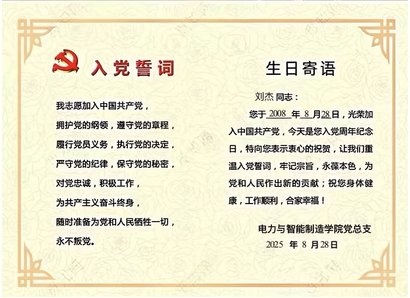 8月28日,电力与智能制造学院教师党支部给支部教师党员刘杰过了一次“政治生日”。