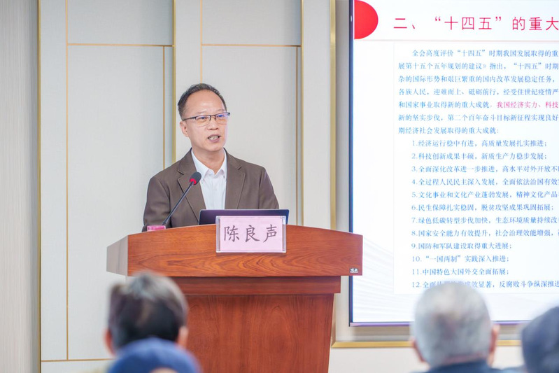陈良声指出,四中全会对“十五五”时期经济社会发展作出顶层设计和战略擘画,为全党全国各族人民把中国式现代化宏伟事业不断推向前进明确了方向和路径,也从科技自立自强水平大幅提高、一体推进教育科技人才发展、弘扬和践行社会主义核心价值观、办好人民满意的教育等方面为未来五年教育发展指明了方向。陈良声还通过深入解读《关于推动现代职业教育高质量发展的意见》指出,职业教育是国民教育体系和人力资源开发的重要组成部分,肩负着培养多样化人才、传承技术技能、促进就业创业的重要职责,在全面建设社会主义现代化国家新征程中,职业教育前途广阔、大有可为。