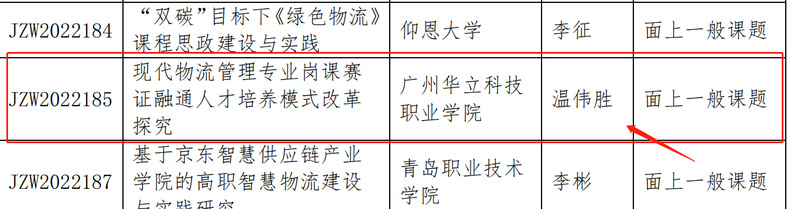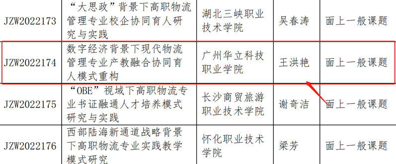 根据《关于申报2022年全国高校、职业院校物流教改教研课题的通知》(物学字〔2022〕5号),中国物流学会、教育部高等学校物流管理与工程类专业教学指导委员会和全国物流职业教育教学指导委员会共同研究启动了2022年全国高校、职业院校物流教改教研课题申报工作。本次申报选题涉及物流行业发展与区域人才需求、物流专业数字化转型、课程思政建设、教学改革、创新创业、产教融合与校企合作、师资队伍建设、课程与资源建设、教学评价体系构建与研究、1+X证书制度试点等方面。经自主申报、资格审查、专家评审、综合评议等程序,最终决定366项课题(其中培育课题15项,面上课题351项)列入“2022年全国高校、职业院校物流教改教研课题计划名单”。其中我校王洪艳老师的课题《数字经济背景下现代物流管理专业产教融合协同育人模式重构》和温伟胜老师的课题《现代物流管理专业岗课赛证融通人才培养模式改革探究》顺利入选。