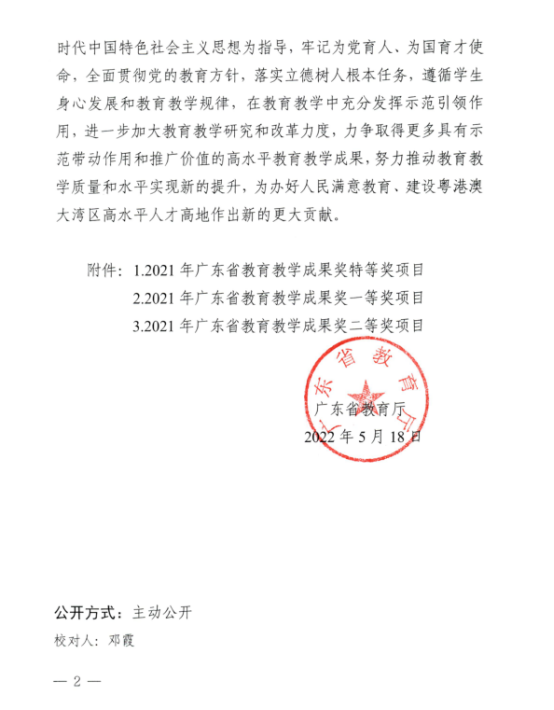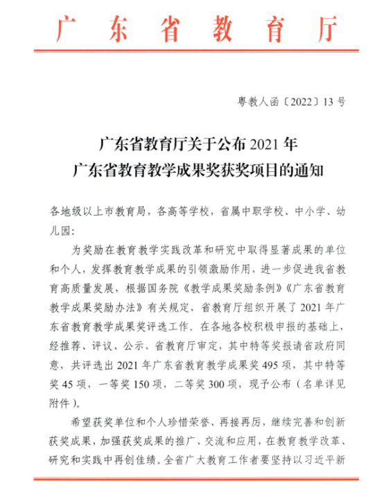 根据《广东省教育厅关于公布2021年广东省教育教学成果奖获奖项目的通知》(粤教人函〔2022〕13号),我校财经学院团队的教学成果项目《高职财会类专业校企“共建共育共成长”人才培养模式的探索与实践》获2021年广东职业教育教学成果奖二等奖项目。