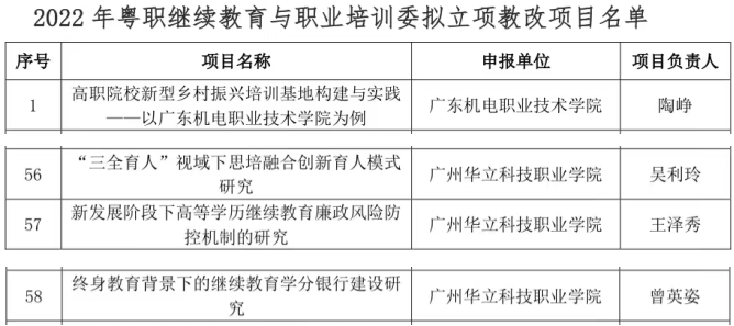 广东省职业院校继续教育与职业培训工作指导委员会今年9月启动了2022年度教学改革项目的申报工作,经各高职院校自主申报、形式审查、专家评审等程序,现予以公示。根据公示结果,我校吴利玲、王泽秀、曾英姿三位老师的项目拟公示立项建设。
