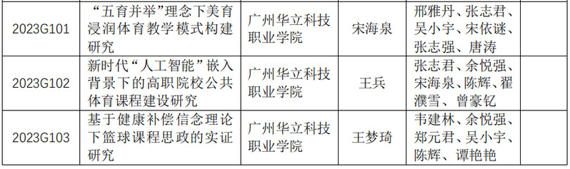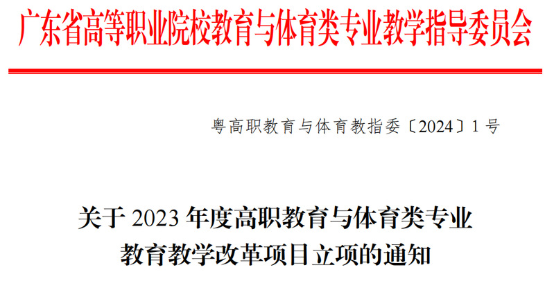 日前,从广东省高等职业院校教育与体育类专业教学指导委员会文件《关于2023年高职教育与体育类专业教育教学改革项目立项的通知》(粤高职教育与体育教指委〔2024〕1号)获悉,我校推荐申报的3项课题《“五育并举”理念下美育浸润体育教学模式构建研究》(主持人:宋海泉)《新时代“人工智能”嵌入背景下的高职院校公共体育课程建设研究》(主持人:王兵)《基于健康补偿信念理论下篮球课程思政的实证研究》(主持人:王梦琦)作为2023年高职教育与体育类专业教育教学改革项目立项。具体名单如下: