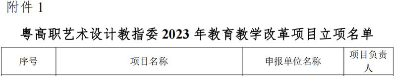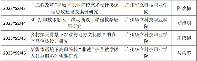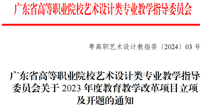 日前,从广东省高等职业院校艺术设计类专业教学指导委员会文件《广东省高等职业院校艺术设计类专业教学指导委员会关于2023年度教育教学改革项目立项及开题的通知》(粤高职艺术设计教指委〔2024〕03 号)获悉,我校推荐申报的4项课题《“三教改革”视域下职业院校艺术设计类课程思政建设及案例研究》(主持人:陈改梅;项目编号:2023YSSJ43)、《3D 打印技术融入三维动画设计课程教学应用研究》(主持人:郑黎明;项目编号:2023YSSJ44)、《乡村振兴背景下农业与地方文化融合的农产品包装设计研究》(主持人:宋依谜;项目编号:2023YSSJ45)、《新媒体语境下高职院校“非遗”技艺教学融入社会服务的实践研究》(主持人:马英超;项目编号:2023YSSJ46)作为广东省高等职业院校艺术设计类专业教学指导委员2023 年度教育教学改革项目立项。具体名单如下: