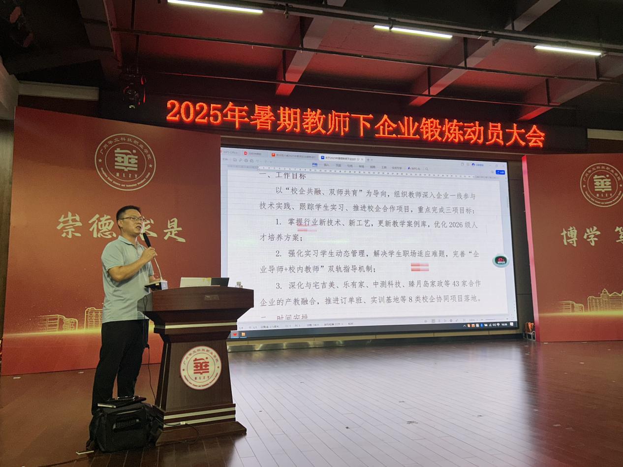 为进一步加强“双师型”教师队伍建设,提升教师实践教学能力,促进学校人才培养与企业需求紧密对接,2025年7月15日,我校召开2025年暑期教师企业实践动员大会。全体参与企业实践的教师齐聚一堂,共同为即将开启的企业实践之旅加油鼓劲。