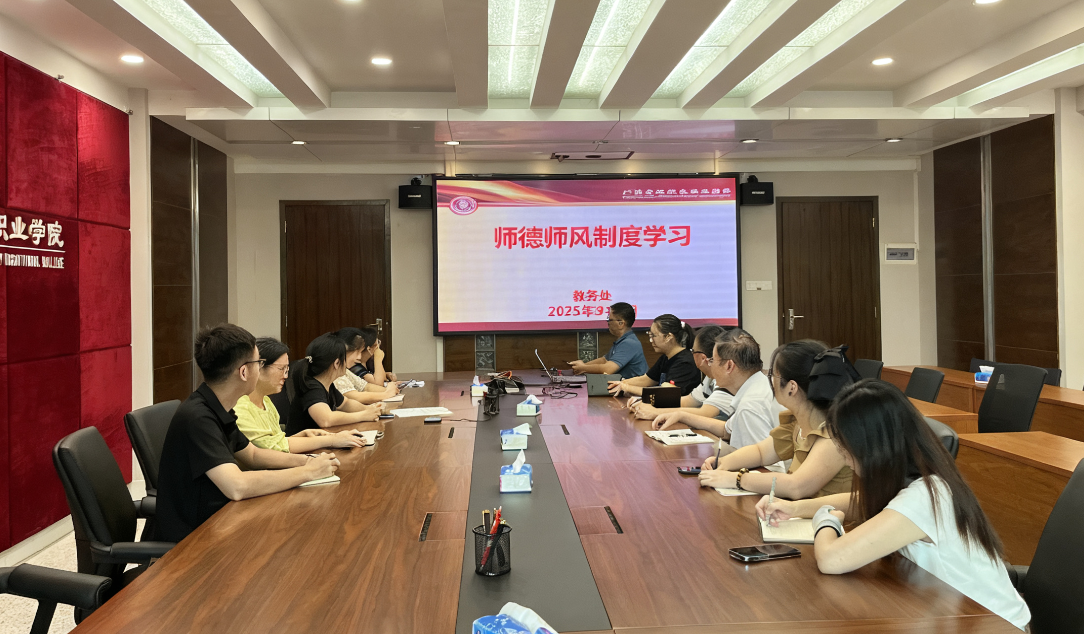 在专题学习会议中,教务处全体人员系统学习了《高等学校教师职业道德规范》和《新时代高校教师职业行为十项准则》,围绕“坚定政治方向、自觉爱国守法、传播优秀文化、潜心教书育人、关心爱护学生、坚持言行雅正、遵守学术规范、秉持公平诚信、坚守廉洁自律、积极奉献社会”等十方面内容展开深入研讨。大家一致表示,要将师德规范内化于心、外化于行,真正做到以德立身、以德立学、以德施教。