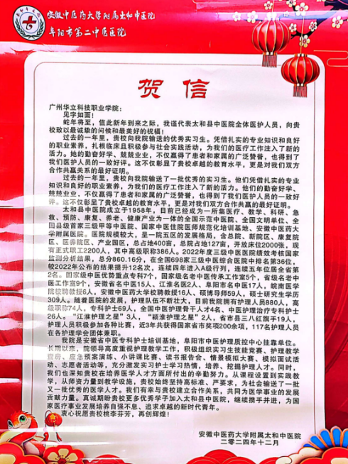 2025年1月14日,我院收到来自安徽中医药大学附属太和中医院的一封贺信。字里行间中表达了在过去的一年里,健康学院向安徽中医药大学附属太和中医院输送了大量优秀实习生,不仅为安徽中医药大学附属太和中医院的医疗工作注入了活力,也赢得了患者和家属的广泛赞誉。
