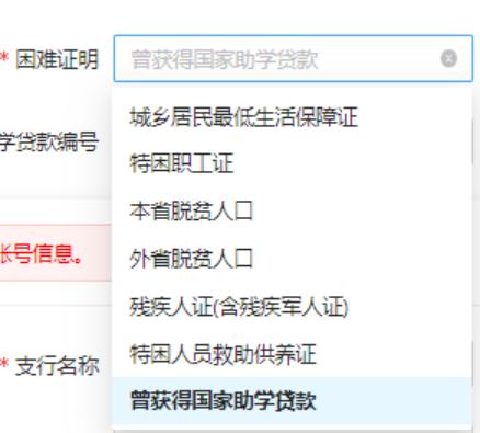 5.助学贷款合同编号:选择困难证明为曾获得国家助学贷款时则显示,选择其它困难证明不显示