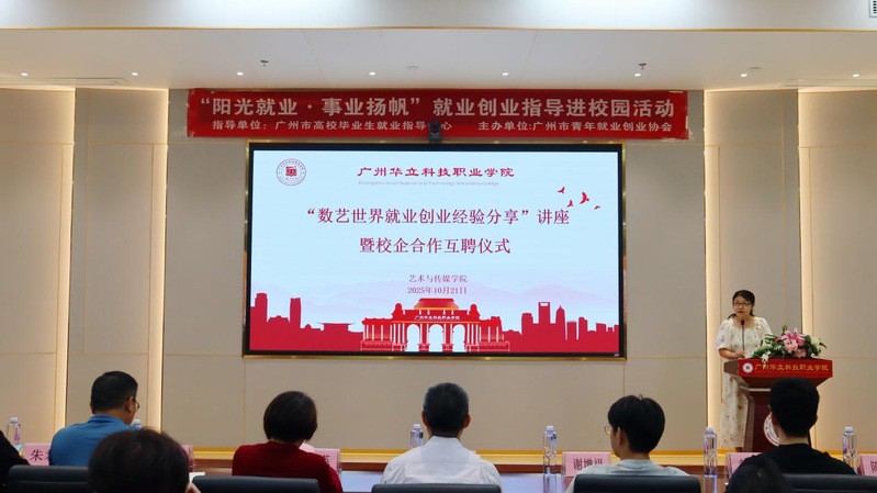 为深化产教融合,拓宽学生就业创业视野,2025年10月21日下午,广州华立科技职业学院艺术与传媒学院与广州冠岳网络科技有限公司在学校图书馆104隆重举行了“数艺世界”校企合作签约授牌互聘仪式暨就业创业经验分享会。本次活动得到了校企双方的高度重视。学校副校长陈显强、教务处处长孙丽英、实践教学科科长韦建林,艺术与传媒学院院长朱君、党总支书记陈改梅等领导老师出席活动。广州冠岳网络科技有限公司谢增福经理、黄龙城项目总监作为企业方代表参会。