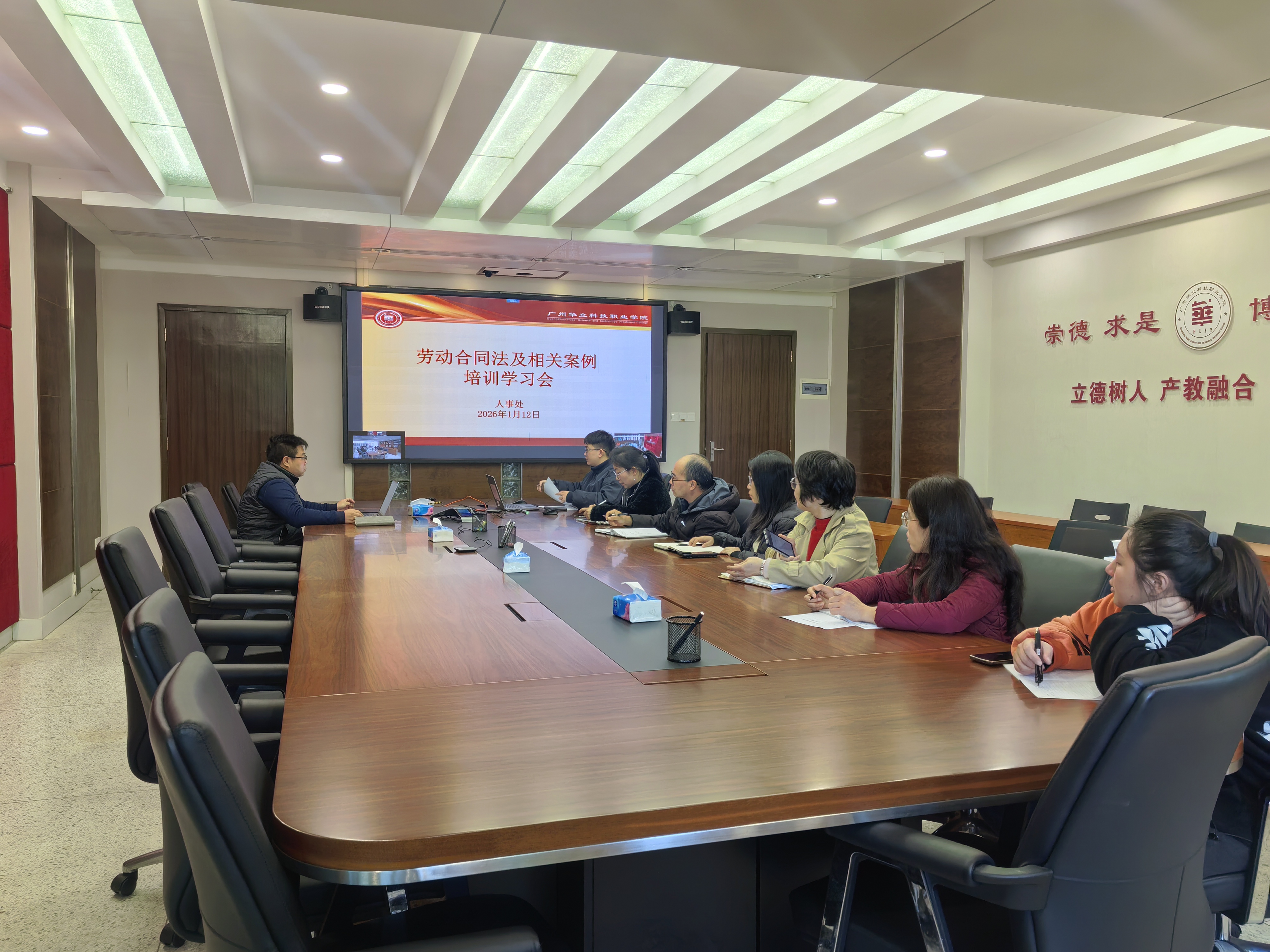 为进一步提升学校合规管理水平,增强风险防范意识,确保教职工手册、劳动合同、规章制度等合法有效,学校于2026年1月12日组织人事管理工作人员开展劳动合同法及相关案例学习培训。