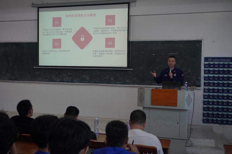 培训会以“防火安全,警钟长鸣”为主题,组织观看了火灾警示教育片,并通报了近期火灾事故情况,要求各单位要吸取经验教训,进行全面自查,坚决遏制各类火灾事故的发生。本次培训会邀请增城区消防救援大队领导陈奕帆进行宣讲。活动中,宣讲员采取理论授课的方式,讲解了近几年全国校园发生的火灾案例,让学校消防队成员进一步了解校园的火灾危险性以及消防安全管理的重要性。从学校消防队成员安全责任为出发点,通过通俗易懂的语言对消防基础常识、防火知识、初期火灾的扑救、自救、日常用电用火、安全疏散与逃生自救等消防安全知识进行了详细讲解。