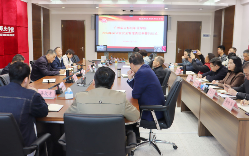 为进一步加强实训室安全管理工作,全面落实实训室安全主体责任,保障教学、科研工作顺利进行,建设更高水平的安全文明校园,3月13日上午,我校举行了2024年《广州华立科技职业学院实训室安全管理责任书》签订仪式。本次签订会议由实验实训中心组织,学校党委书记陈良声、校长陈德清、常务副校长马俊、副校长陈显强、副校长高尧来、副校长王洪艳、校长助理叶春桃、校长助理张剑锋和各二级学院的党政负责人参加了会议。