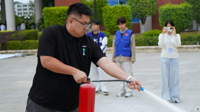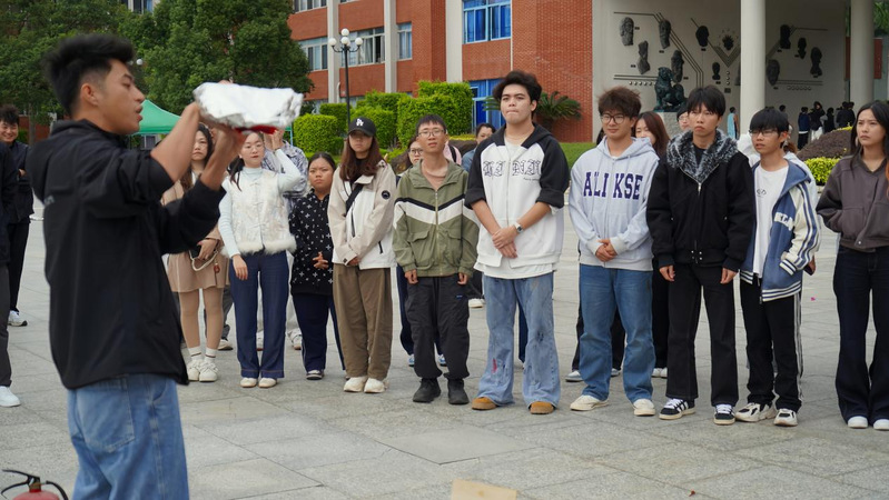 全体演练人员安全到达一楼空旷处后,由保卫处老师教大家如何正确使用灭火设备,并组织师生进行消防灭火设备实战操作。