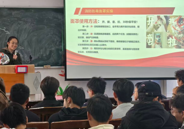 培训中,实训室管理员陈晓欣老师结合实训室日常管理实例,详细解读了仪器设备操作规程,实训室安全管理须知,重点强调了消防安全“预防为先、防消结合”的基本原则。针对实训室可能出现的电气设备故障火灾等突发情况,管理员现场演示了防毒面具的正确佩戴步骤,讲解了灭火器的使用方法,逐一拆解操作要点,每位来讲座的班级代表成为班级安全知识的“传播员”。