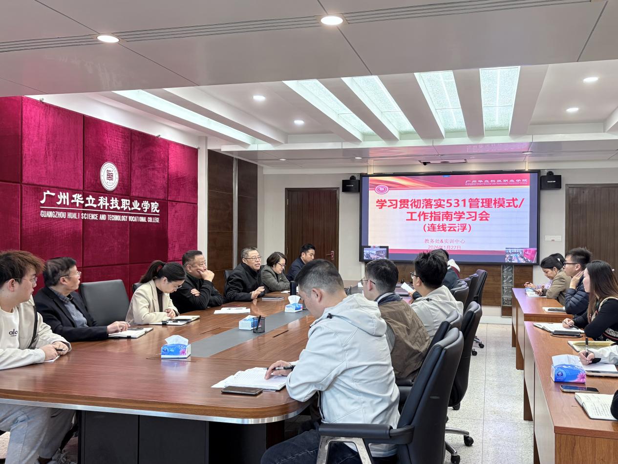 为深入贯彻落实董事会关于“531”管理模式学习及工作指南落地实施的要求,夯实实验实训教学规范化管理根基,助力各项实践教学工作高质量开展,2026年1月22日,我校在行政楼305会议室召开“学习贯彻落实531管理模式暨工作指南学习会(连线云浮)”,实验实训中心联合教务处共同参与学习研讨。