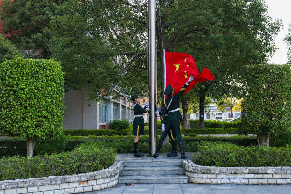 伴随着庄严的《中华人民共和国国歌》,鲜艳的五星红旗冉冉升起,全体师生面向国旗行使注目礼。