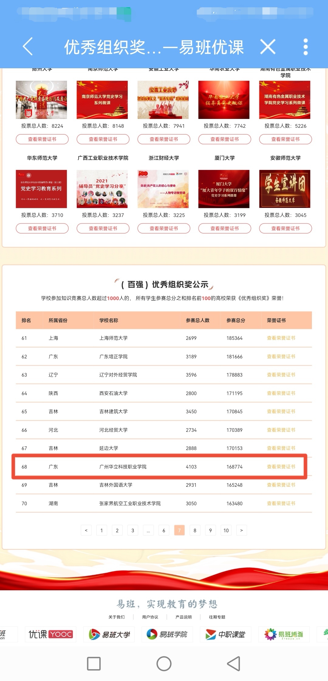 为庆祝中国共产党成立100周年,金秋9月,我院“易班网”基于“易班优课”在线学习平台面向全体学生开展了“2021年易班优课大学生党史学习知识竞赛”活动。本次竞赛活动以全院参赛学生竞赛成绩总分作为本校成绩,以学校为单位进行PK,评选出百强高校。活动历时1个月,经过全体学生的踊跃参与、积极答题、角逐比拼,我院最终以参赛4103人次,参赛总分168774分的总成绩,在全国848所参赛高校中排名第68名次,荣获此次“优课党史学习知识竞赛”活动《优秀组织奖》和《优秀指导教师》等荣誉。