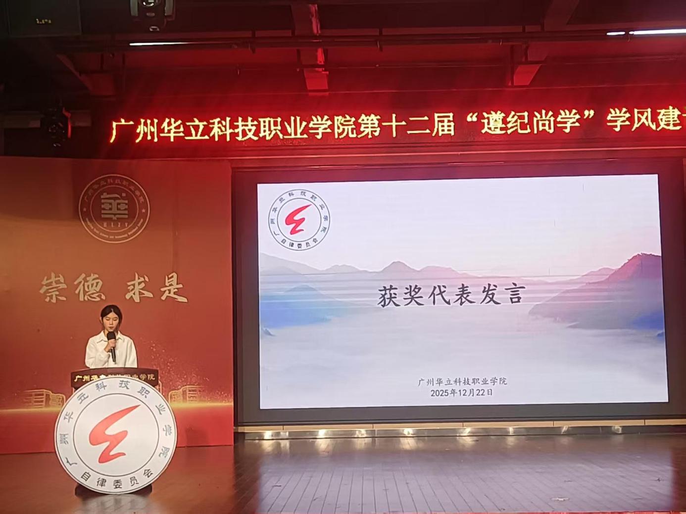 表彰环节中,领导为获奖个人颁发荣誉证书,台下掌声雷动,向榜样致以敬意。“学风标兵”代表黎佩娥上台分享学习心得,呼吁全体同学以诚信立身、以勤学致远,将 “遵纪尚学” 内化于心、外化于行。