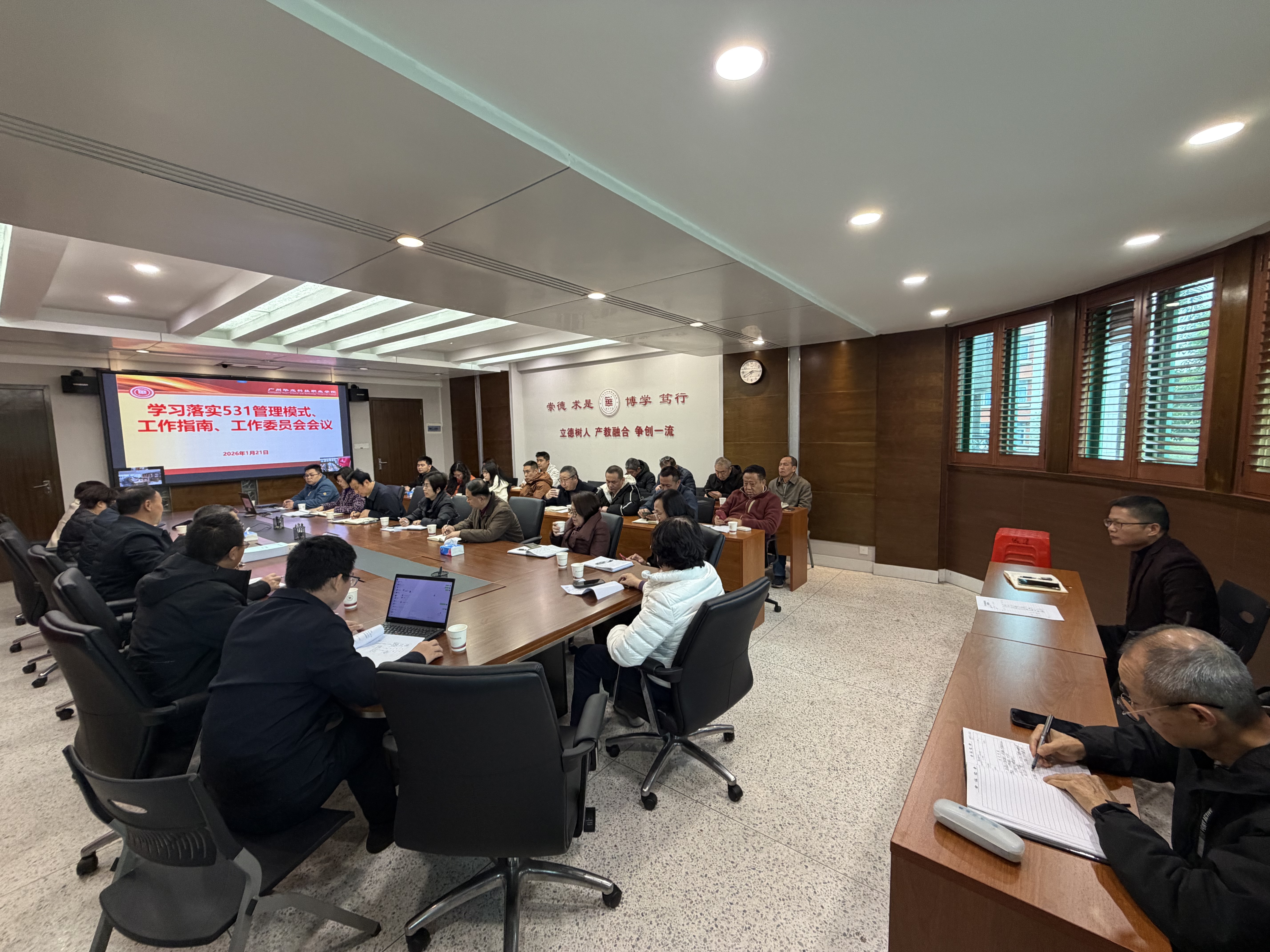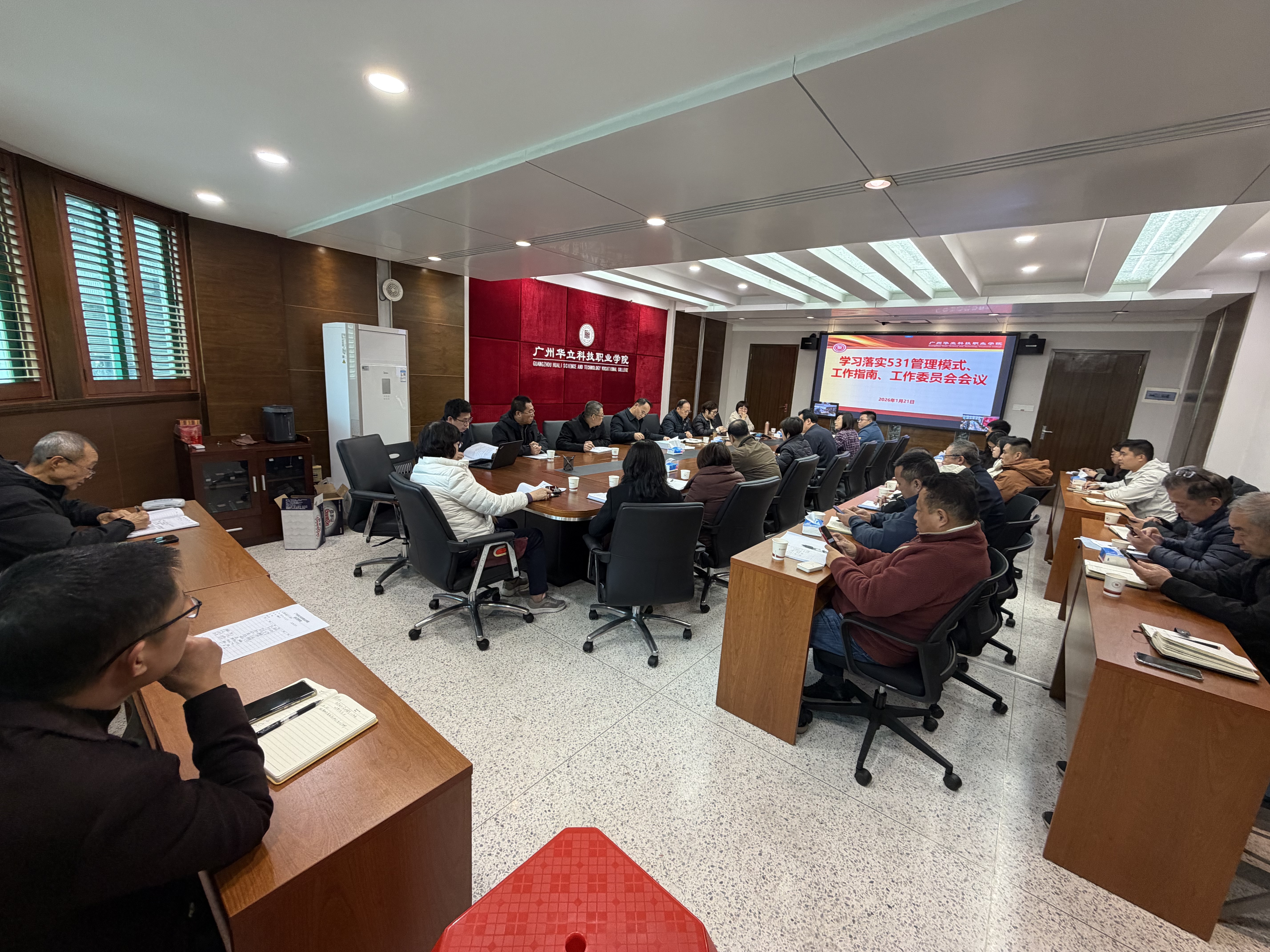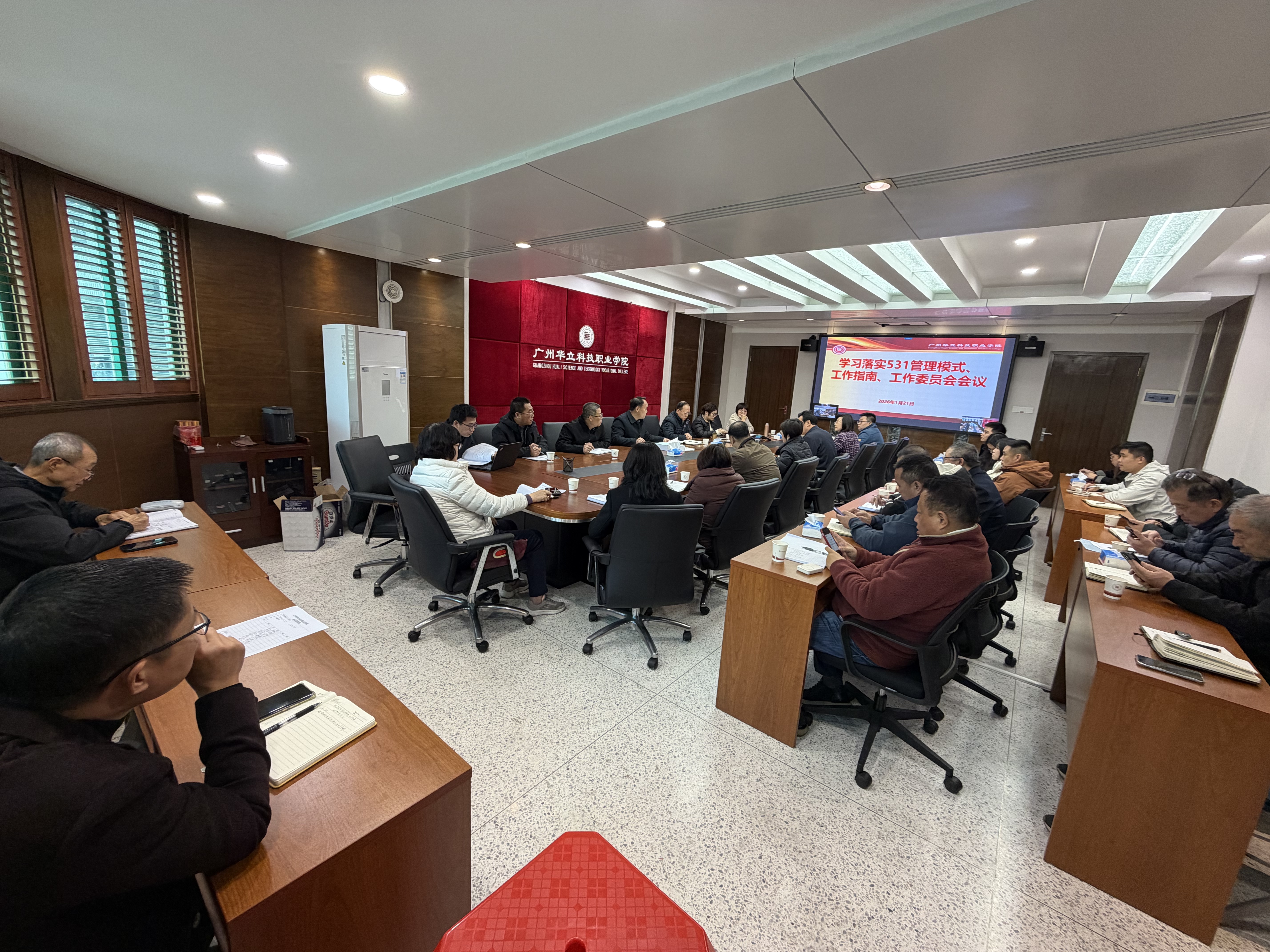 为锚定学校长远发展目标,夯实规范化管理根基,2026年1月21日,广州华立科技职业学院召开学习落实“531”工作计划专题会议,全体校领导、职能部门负责人及二级学院院长齐聚行政楼305会议室,云浮校区同步视频连线,共同学习“531”管理模式核心要义,部署相关工作推进事宜。会议由廖俊杰校长主持。