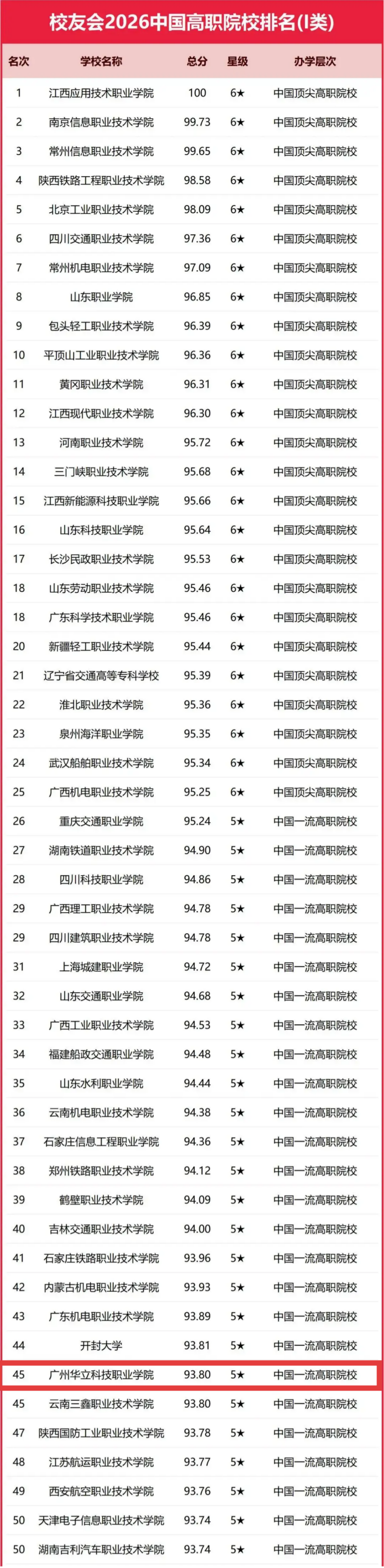 2026年1月12日,《2026校友会中国大学排名:高考志愿填报指南》正式发布,我校在中国高职院校排名(I类)中跃升至第45名,较上一年度上升了40个位次。