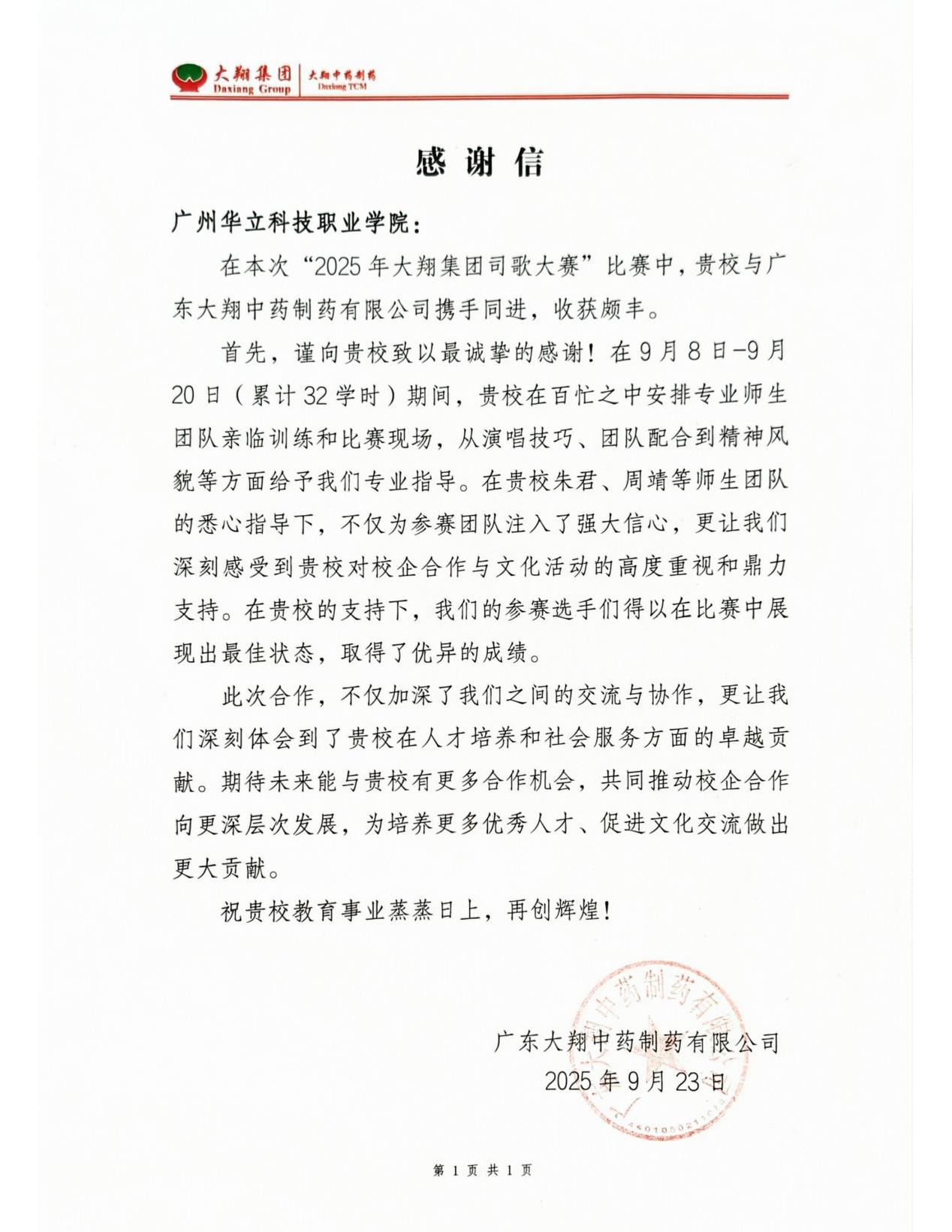 近日,广东大翔中药制药有限公司向广州华立科技职业学院发来感谢信,致谢我校艺术与传媒学院、教育学院师生团队的专业指导,助力其在“大翔集团司歌大赛”中表现优异,成为产教融合的又一成功典范。
