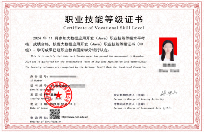 学生可考取国家“1+X”职业等级证书:网络安全评估(中级);大数据应用开发(JAVA)(中级)。