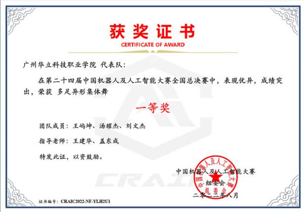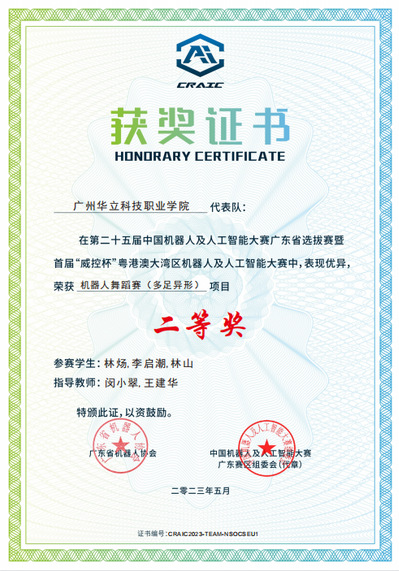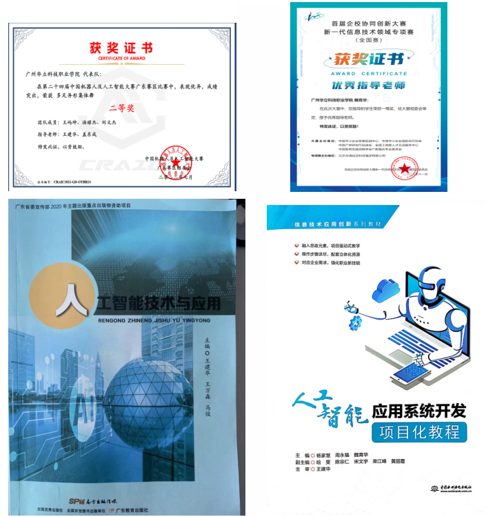 学生团队积极参与各类专业技能大赛与创新赛,充分展示我院学生实践能力与创新精神。其中,在中国机器人及人工智能大赛获从24到27届多次取得全国一等奖。教师团队积极参与人工智能相关书籍编写与科研项目,其中《人工智能技术与应用》获广东省十四五规划教材、省宣传部重点出版物称号,依托人工智能赋能获广东省教学成果奖二等奖,彰显专业教科研实力。