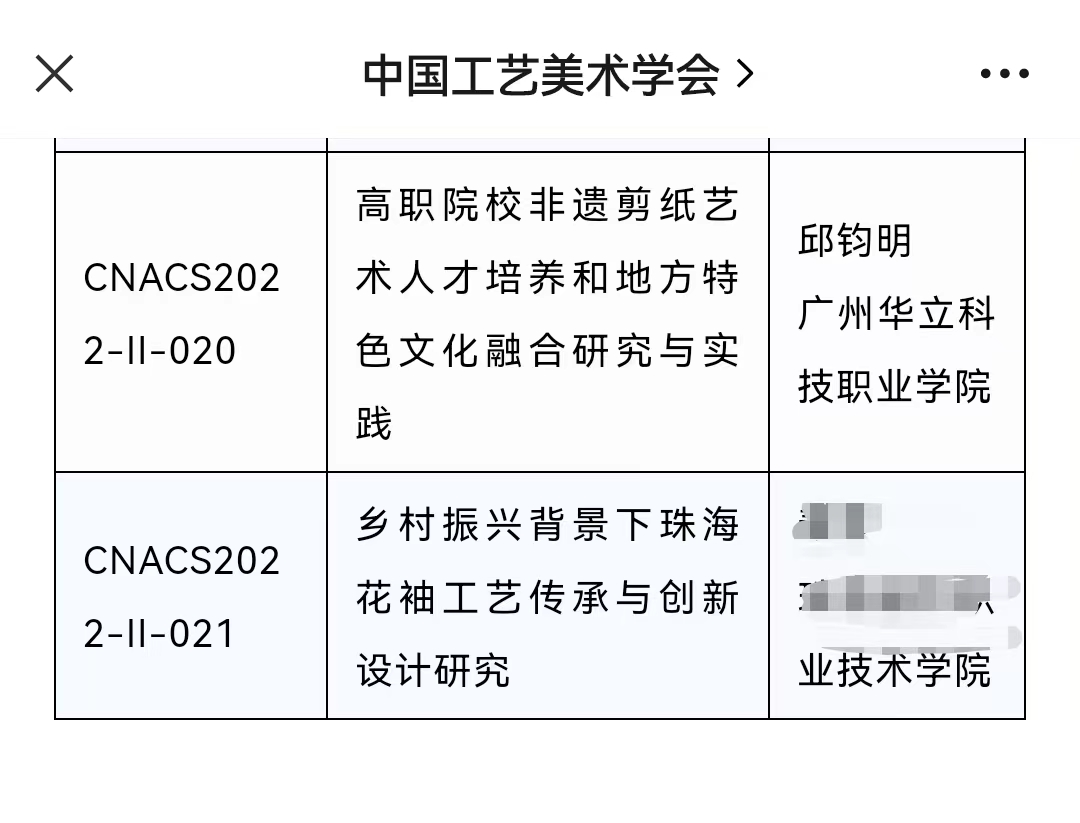 近日,从中国工艺美术学会传来喜讯,广州华立科技职业学院教育学院邱钧明老师申报的课题《高职院校非遗剪纸艺术人才培养和地方特色文化融合研究与实践》获得中国工艺美术学会2022年度工艺美术科研课题研究项目立项!