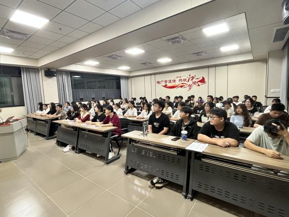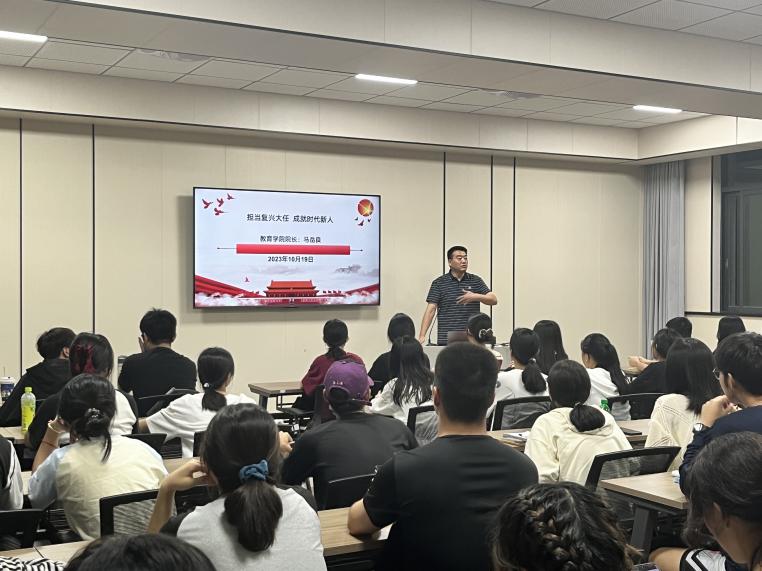 10月19日,教育学院院长马岳良在云浮校区第三教学楼普通话侯测室以“担当复兴大任,成就时代新人”为题,为2023级新生讲授“思政第一课”,教育学院2023级新生代表参加思政课学习。