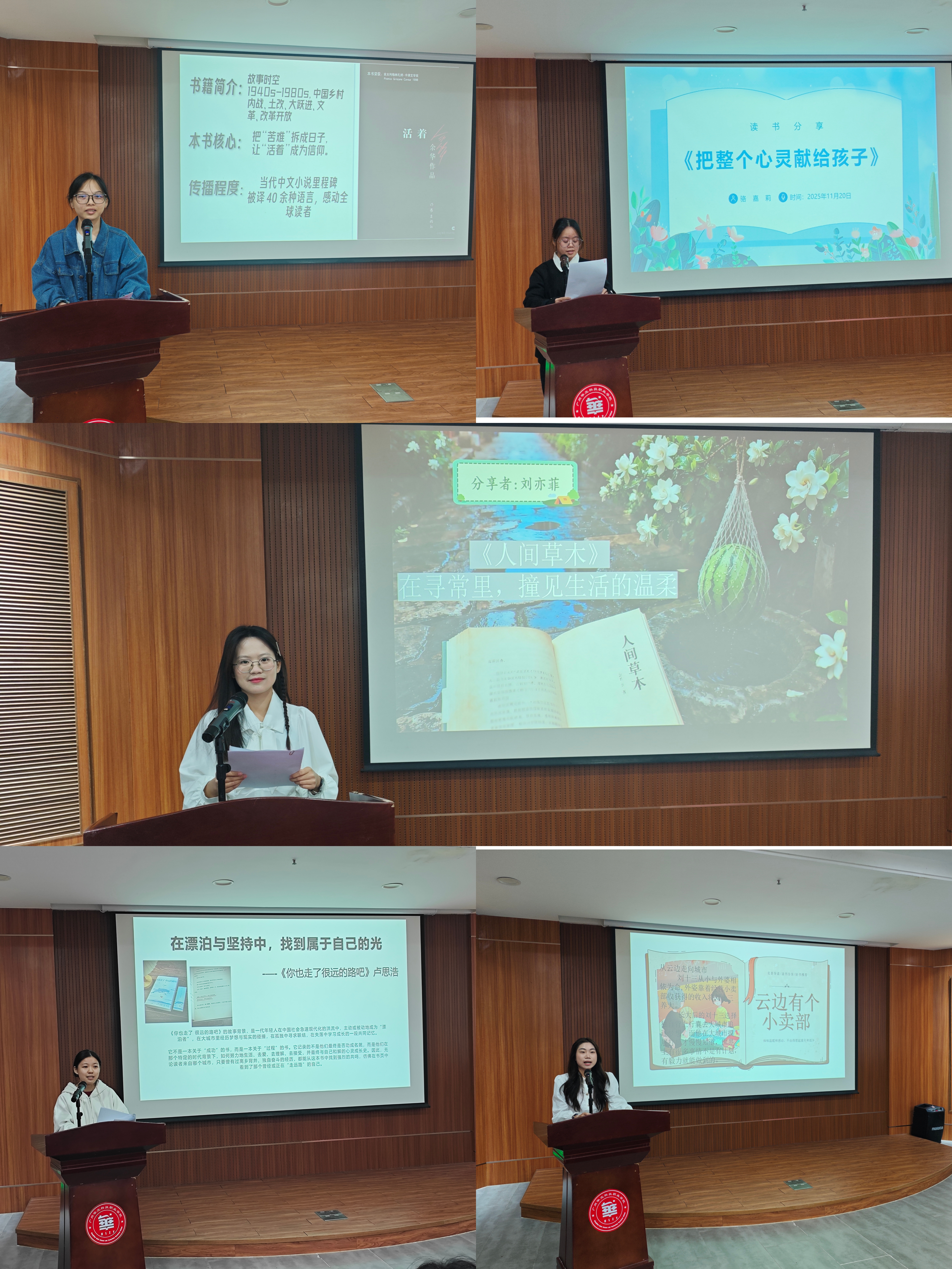 分享会上,同学们从不同维度阐释了阅读对教育工作的启示。孙雅琪同学通过《活着》诠释生命的坚韧,强调教育需要温度与深度;刘亦菲同学借《人间草木》分享生活美学,倡导教育应充满烟火气与诗意;温春霞同学从《云边有个小卖部》中体会陪伴的温情,认为教育是心灵的守望;曾祉滢同学通过《你也走了很远的路吧》探讨成长修行,指出教育者是终身学习者;骆嘉莉同学回归经典《把整个心灵献给孩子》,强调教育需要纯粹的爱心。