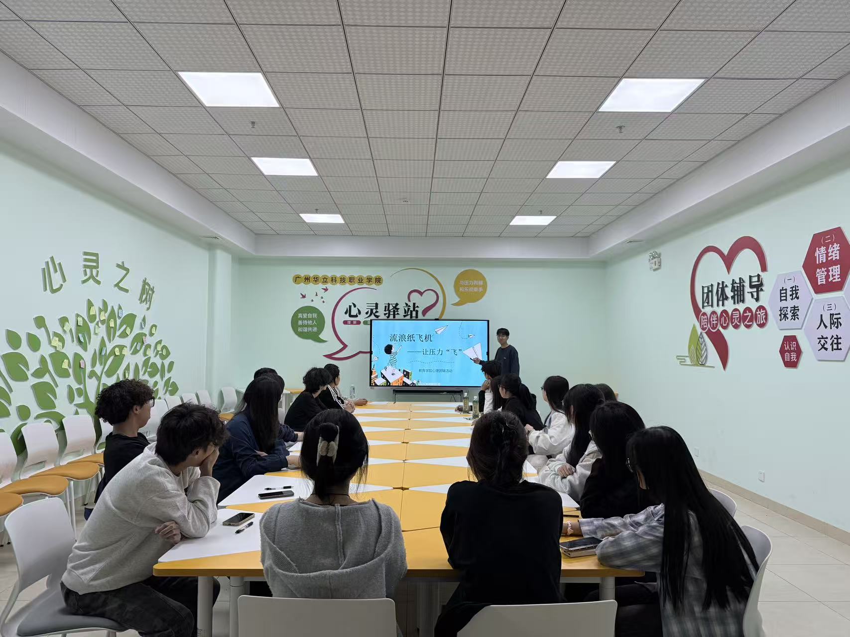 为帮助学生科学应对学业、就业、人际关系等多方面压力,搭建情绪宣泄与同伴互助的支持平台,12 月 24 日晚19:00,广州华立科技职业学院教育学院在云浮校区心理团体辅导活动室成功开展《流浪的纸飞机 —— 让压力飞》心理团体辅导活动,活动由教育学院栾瑞林老师主持,教育学院心理辅导站站长玉成婷老师进行理论指导,助力同学们在轻松互动中解锁减压技巧,收获情感支持。